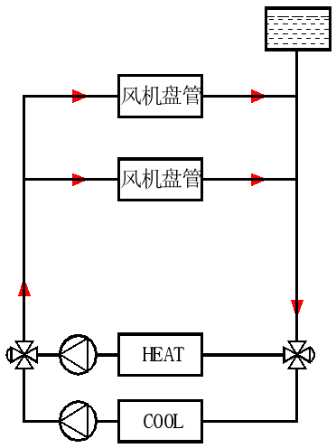 定義:分別設置供冷管路、供熱管路、換熱設備管路三根水管;其冷水與熱水的回水管共用。