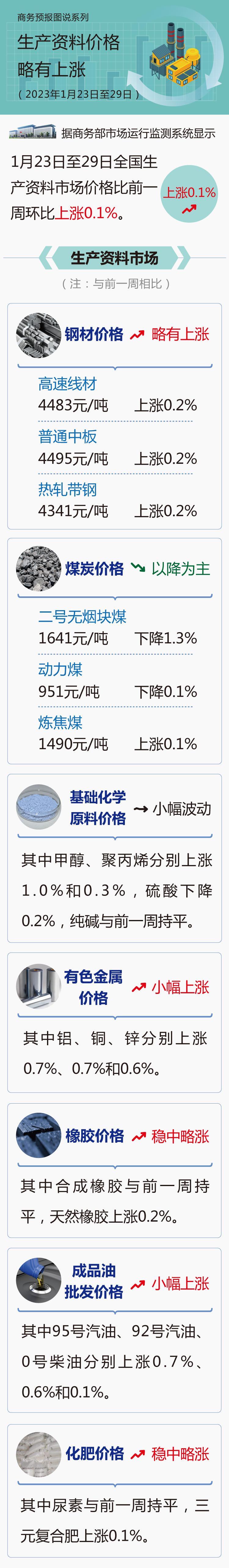 據(jù)商務部市場運行監(jiān)測系統(tǒng)顯示,1月23日至29日,全國生產(chǎn)資料市場價格比前一周上漲0.1%。